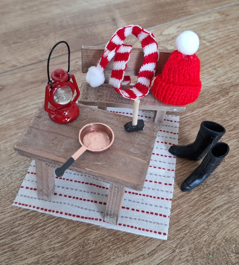 | Bank, Tisch, Teppich | Miniatur-Möbel für die Wichtel-Wohnzimmer. |